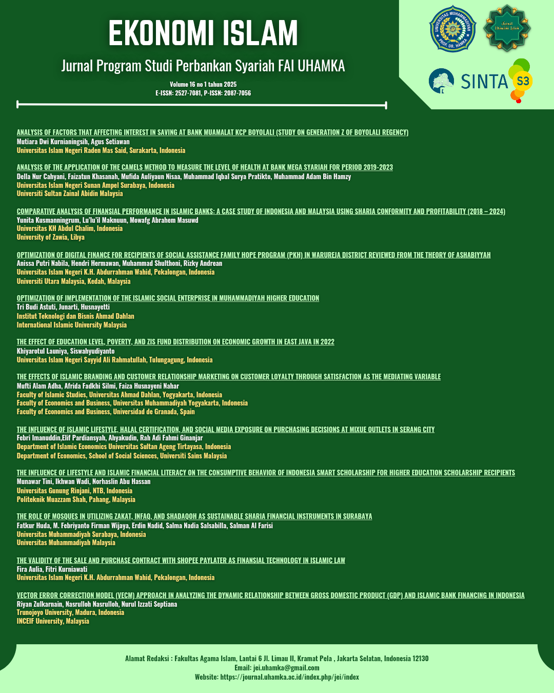 Ekonomi Islam is a journal of the Islamic Banking study program, Faculty of Islamic Studies, Universitas Muhammadiyah Prof DR HAMKA (E-ISSN: 2527-7081, P-ISSN: 2087-7056). The Ekonomi Islam is a national peer-reviewed journal. This is a semi-annual journal, published twice a year (May and November). Ekonomi Islam has been acknowledged by the Republic of Indonesia's Ministry of Research, Technology, and Higher Education since 2020 with grade 4 (Sinta 4) accreditation.