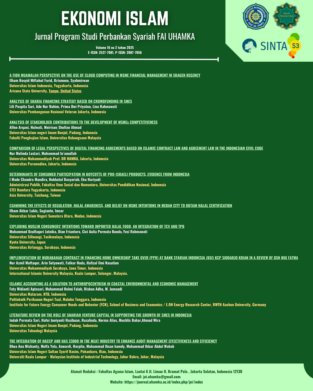 EKONOMI ISLAM is a journal focused on Islamic Economics, Islamic Banking, Islamic Capital Market, Management from an Islamic Perspective, Islamic Business Ethics, and the Principles and Practices of Sharia Law. The journal is open and welcomes contributions from various disciplines and research approaches, including quantitative, qualitative, and mixed methods. This edition has been available online since November 30, 2025. All articles in this volume (12 original research articles) were written by 46 authors from 24 affiliations across 5 countries (Indonesia, Amerika Serikat, Taiwan, Jerman, Malaysia, Jepang). The affiliations are as follows: