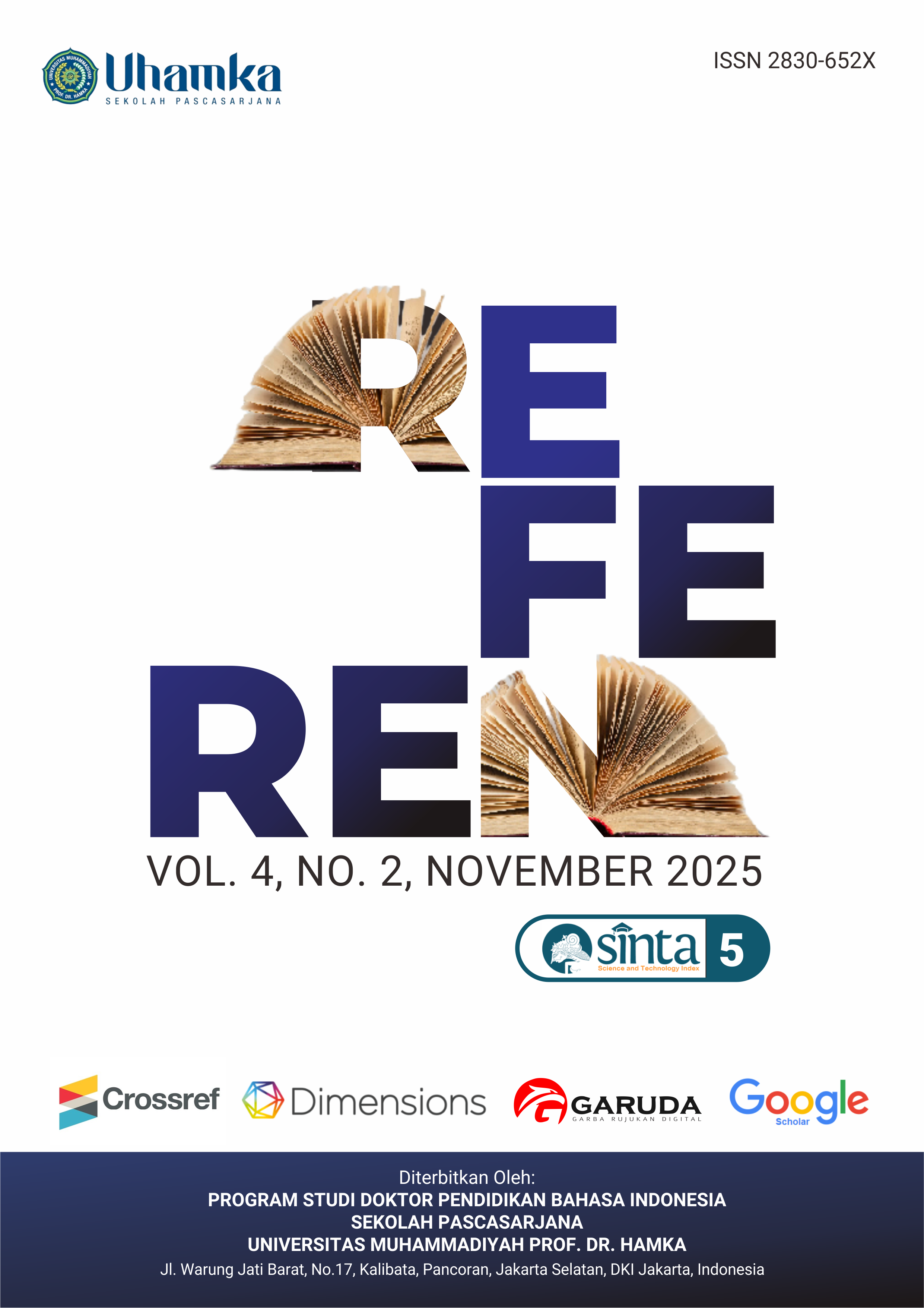 REFEREN merupakan jurnal ilmiah dibuat dengan impian untuk menjadi rujukan bagi para peneliti terutama di bidang Pembelajaran Bahasa, Pengkajian Bahasa, dan Pengkajian Sastra. Edisi kali ini diiisi oleh peneliti yang berasal dari berbagai perguruan tinggi, yaitu Universitas Muhammadiyah Prof. Dr. Hamka, Universitas Muhammadiyah AR. Fachrudin, Universitas Muhammadiyah Tangerang, Universitas Pamulang, Universitas Muhammadiyah Pekajangan Pekalongan, Universitas Pancasakti TegaL, dan Universitas Muhammadiyah Tangerang.